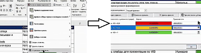 Выделите ячейки, где будут индикаторы. Перейдите: «Условное форматирование» → «Управление правилами» → «Правило поиска дубликатов» (дублируем правило) → «Изменить правило».