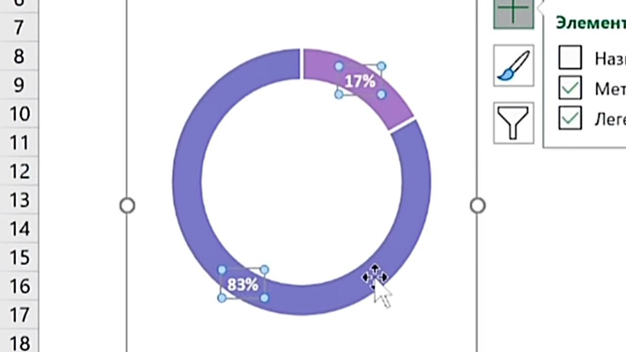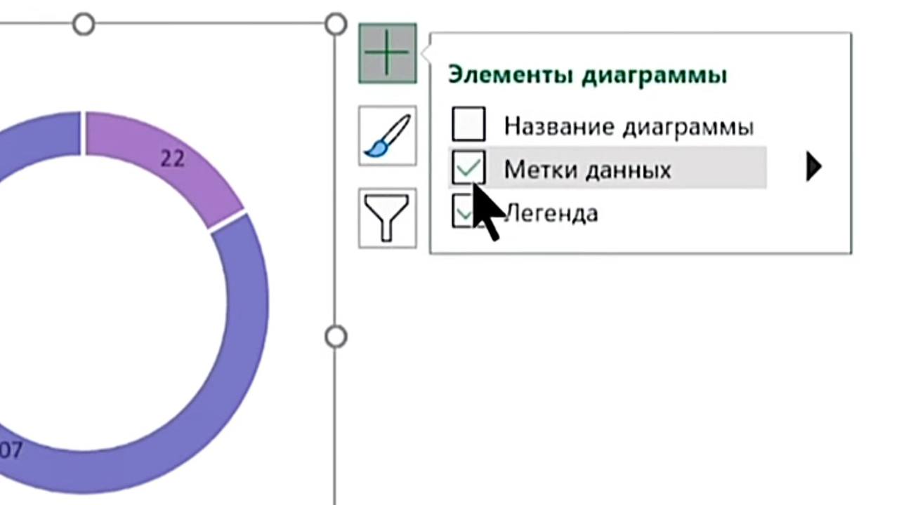 - Кликните правой кнопкой мыши по диаграмме, на знак плюса правее и выберите «Метки данных».