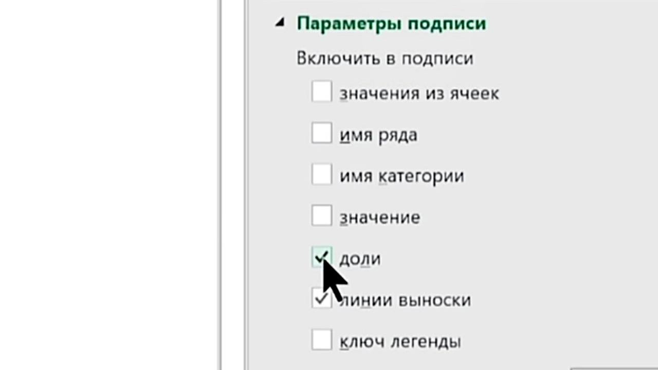 - В открывшейся панели справа в разделе «Параметры подписи» отметьте «Доли» и снимите галочку с «Значения». В результате на диаграмме отобразятся проценты.