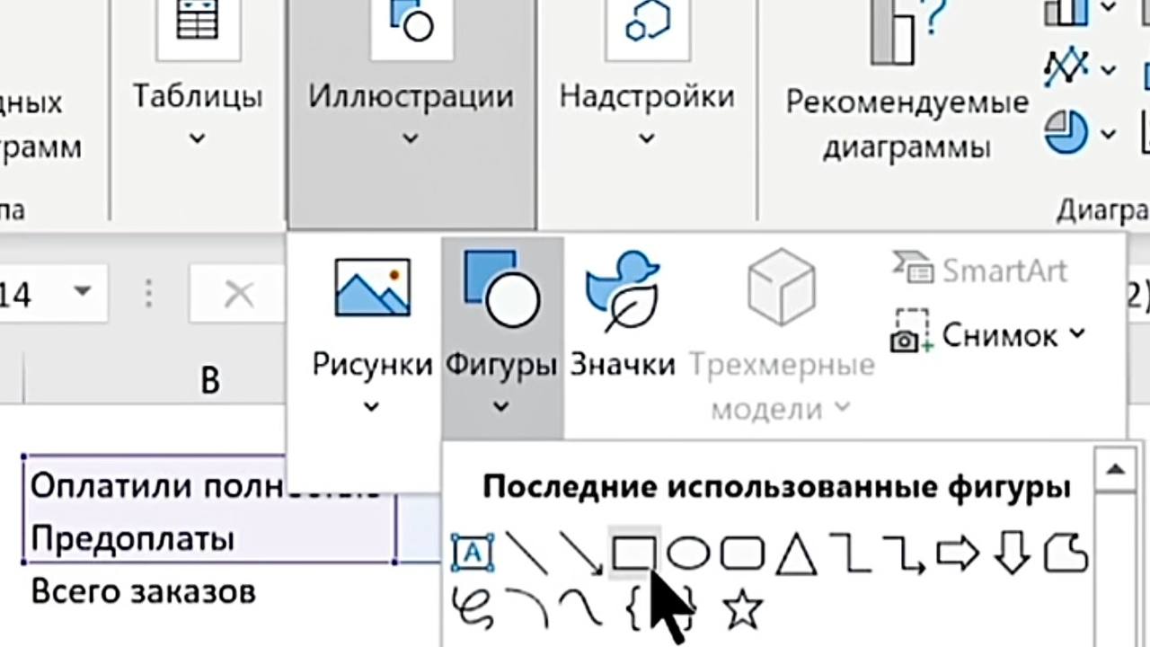 - Перейдите на вкладку «Вставка», в группе «Иллюстрации» нажмите «Фигуры» и выберите любую фигуру, например, «Овал» или «Прямоугольник».