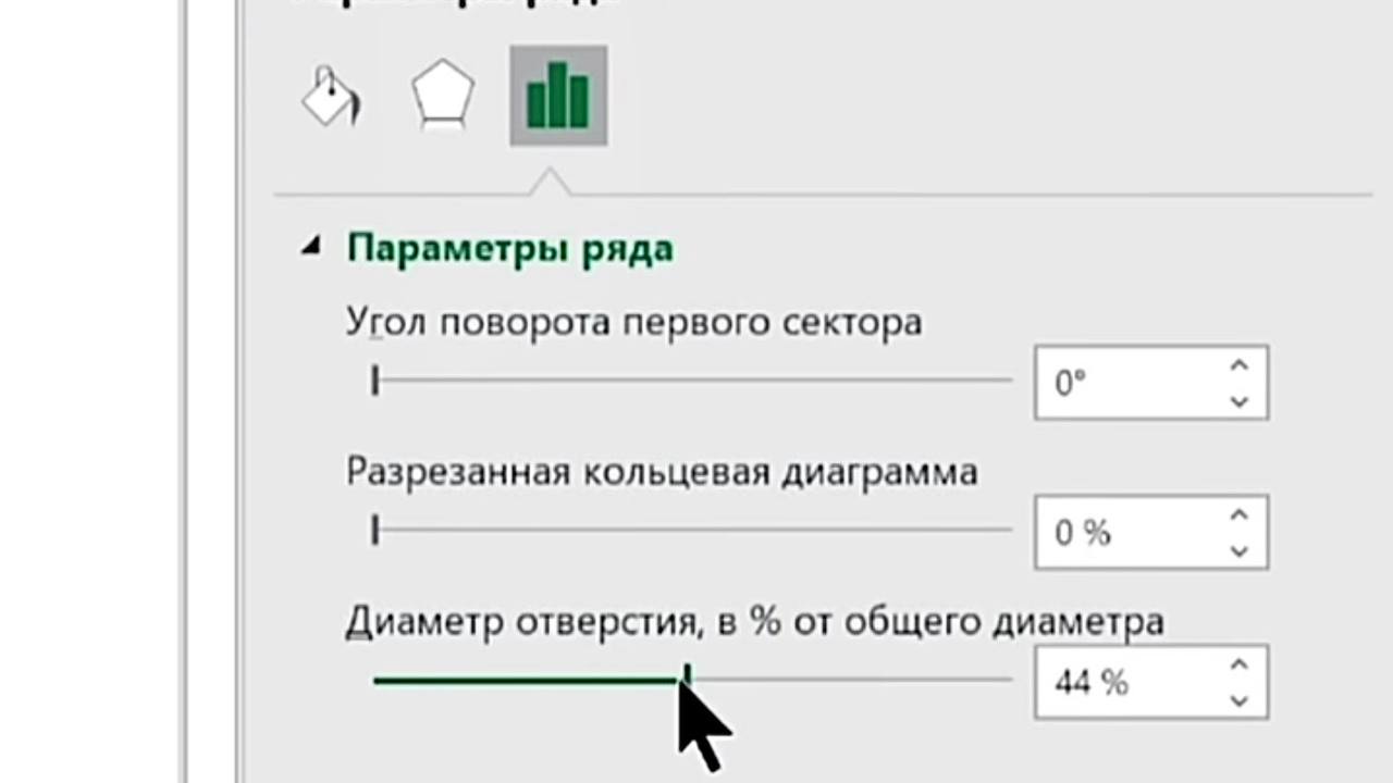 - Кликните по любому сегменту диаграммы (кольцу) правой кнопкой мыши и выберите «Формат ряда данных». В панели справа найдите параметр «Диаметр отверстия кольца» и уменьшите его процент от общего диаметра (например, до 30-40%), чтобы увеличить ширину кольца и освободить место в центре.