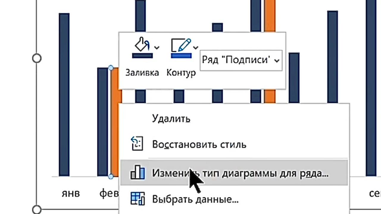 - Кликните правой кнопкой мыши по любому из добавленных столбцов и выберите «Изменить тип диаграммы для ряда».