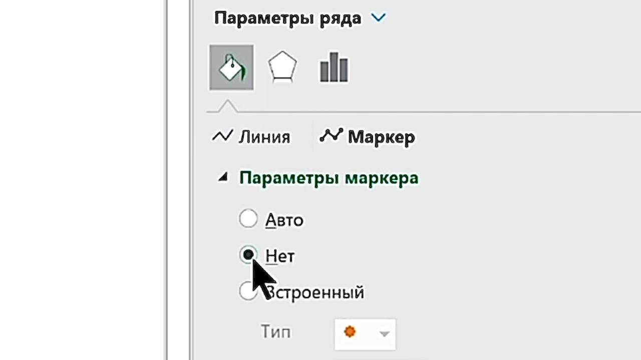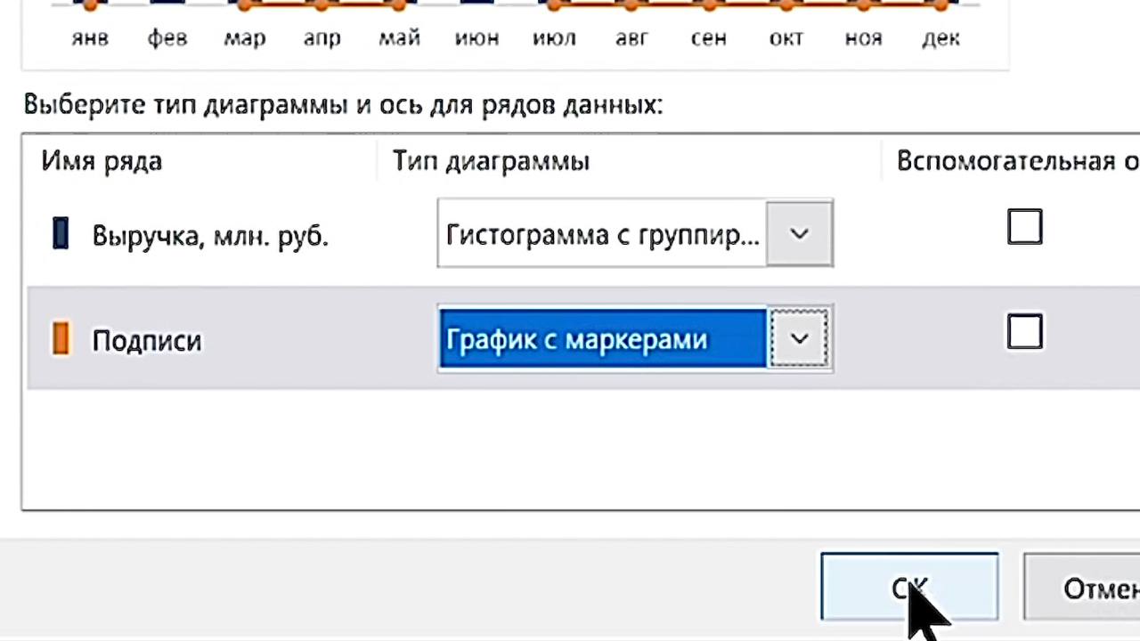 2. В открывшемся окне в имени ряда с максимальным и минимальным значениями (например, «Подписи») выберите «График с маркерами».