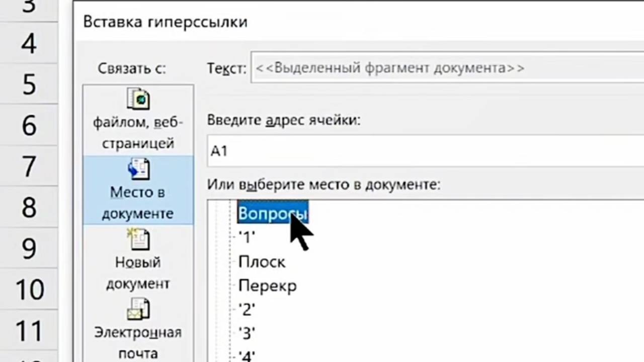 3. В левом меню диалогового окна выберите «Место в документе».