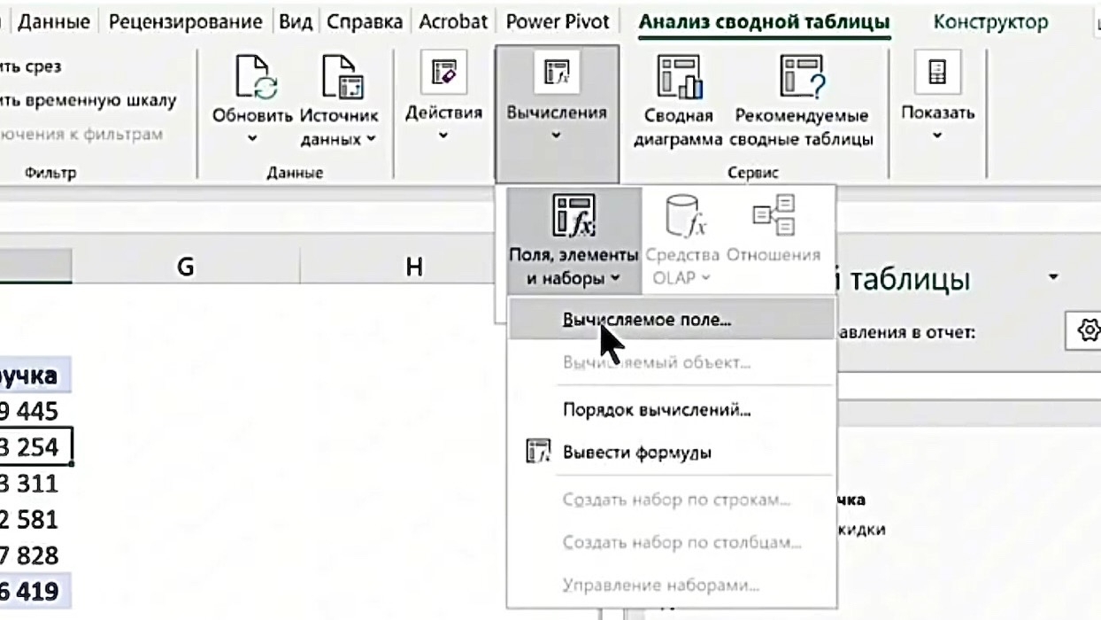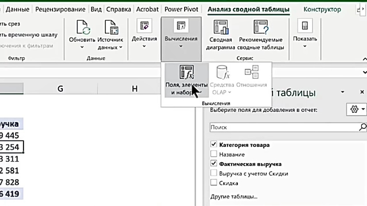 - В группе «Вычисления» нажмите кнопку «Поля, элементы и наборы».