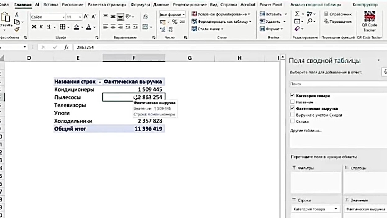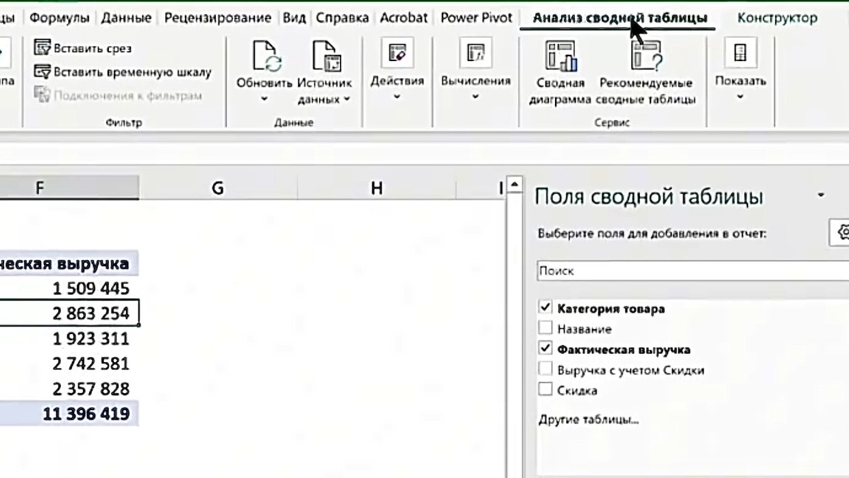 2. На ленте появится контекстный раздел «Работа со сводными таблицами».