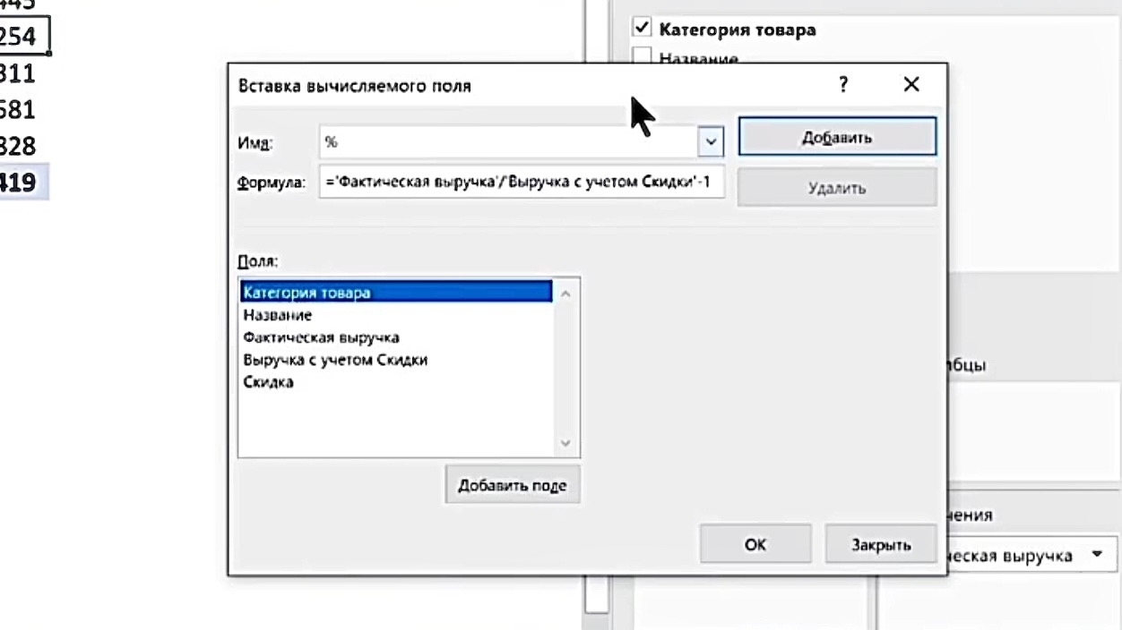 - В поле «Формула» удалите предлагаемый ноль и введите нужное выражение, используя существующие поля сводной таблицы.