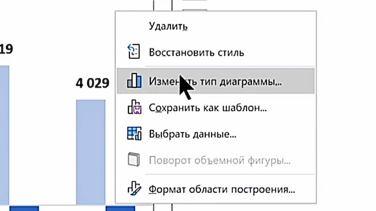 - Кликните правой кнопкой мыши по любому элементу нового ряда (по новым столбцам) и выберите «Изменить тип диаграммы».