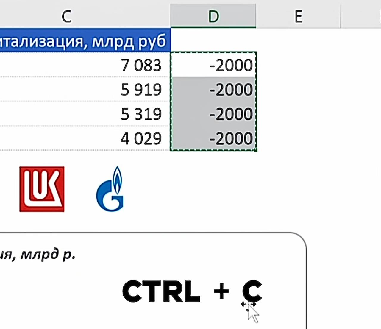 - Если ваши основные показатели колеблются в диапазоне, скажем, от 4000 до 7000, введите в столбец С значения, равные этим показателям минус 2000. Это сместит картинки ниже столбцов.