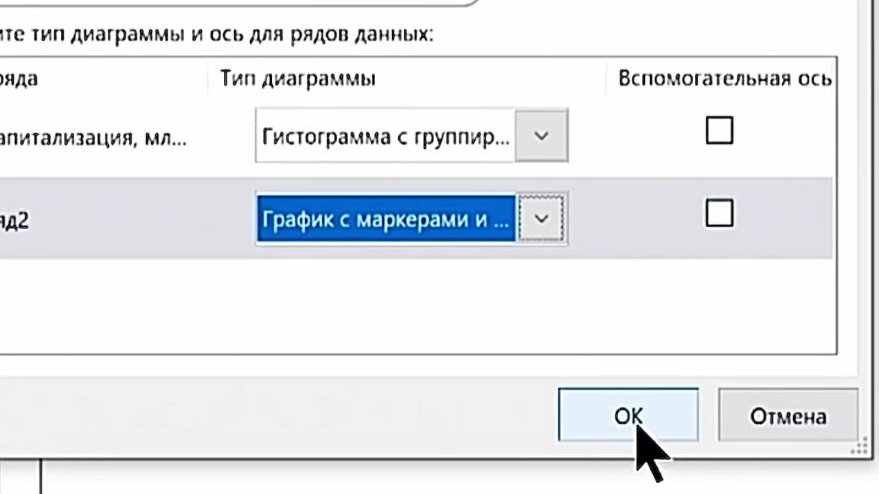 2. В открывшемся диалоговом окне выберите для этого ряда тип «График с маркерами». Основные данные пусть остаются гистограммой. Нажмите «ОК».