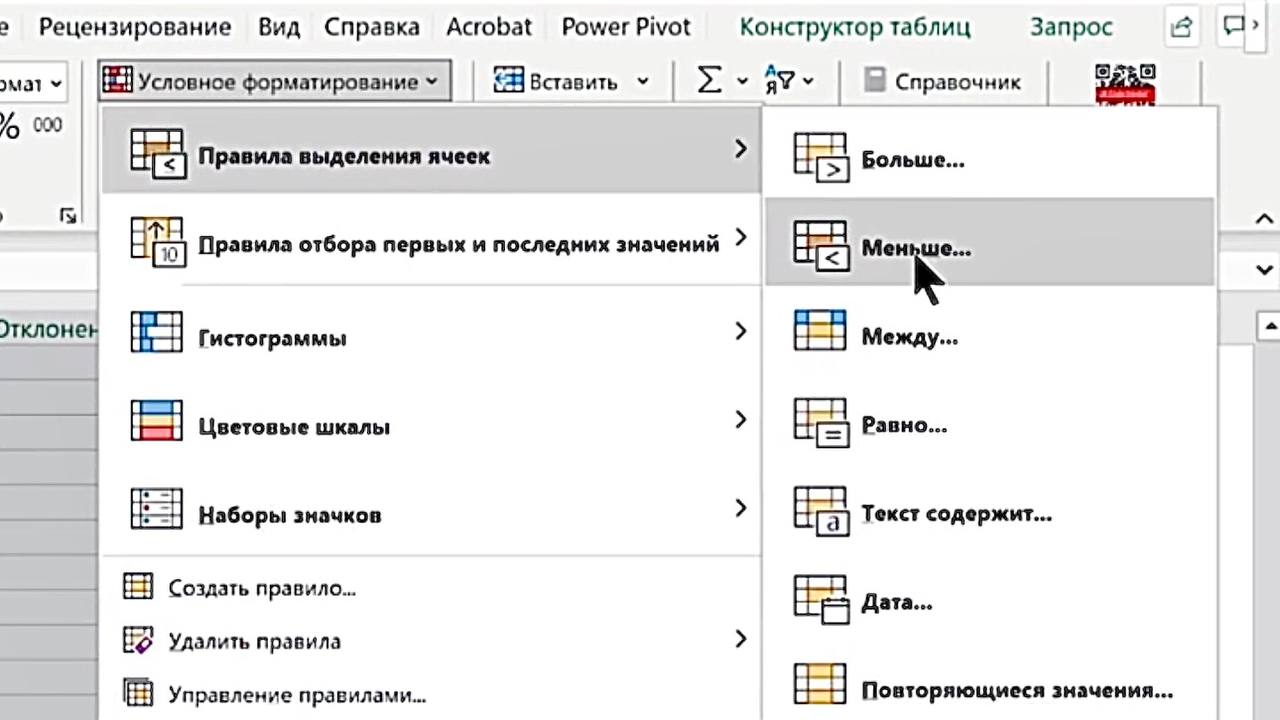 3. В выпадающем меню выберите «Правила выделения ячеек» → «Меньше».