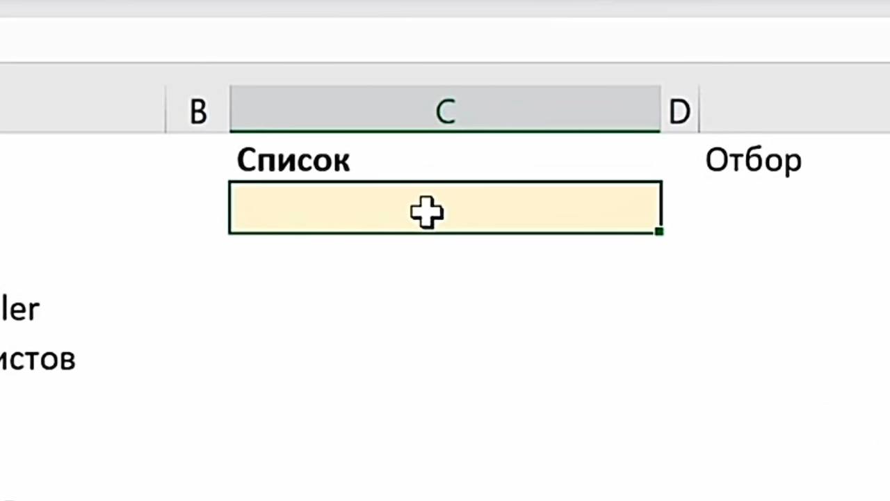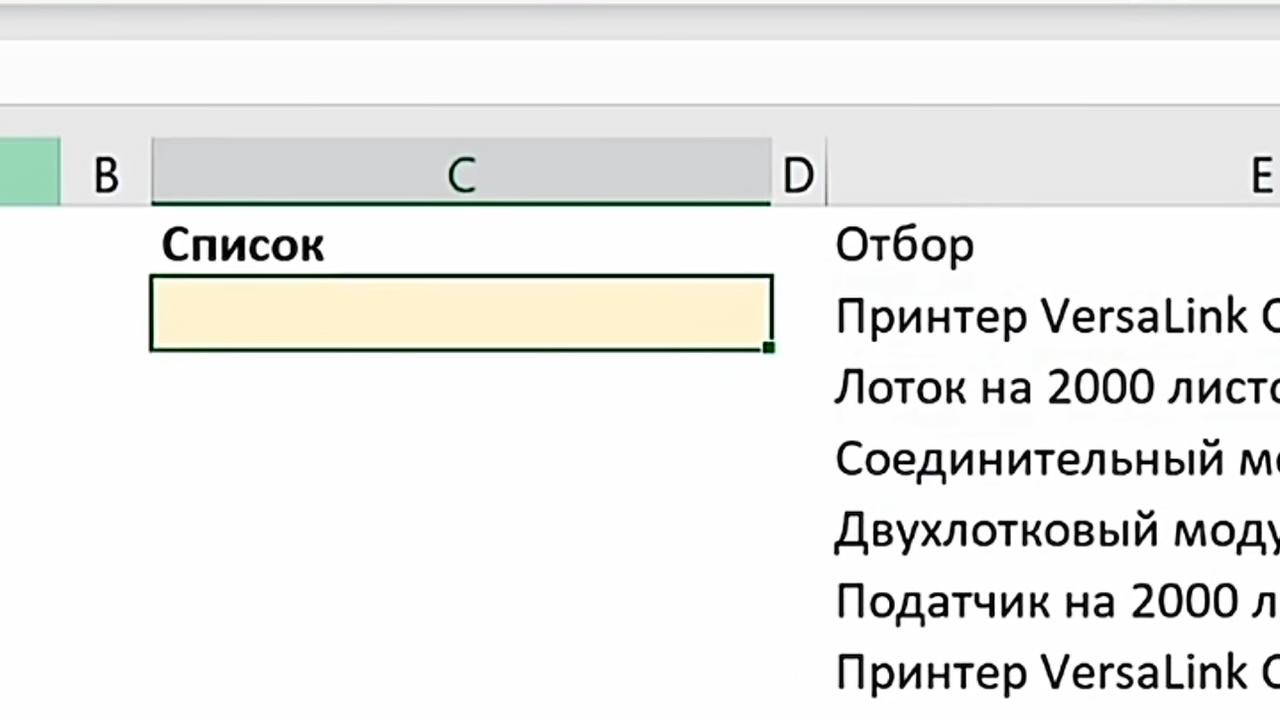 - Справа от вашего основного справочника (например, столбца A со списком товаров) создайте 2 новых столбца (например, столбец B «Список», где вы будете искать значения, и столбец C «Отбор», где вы создадите список для поиска).