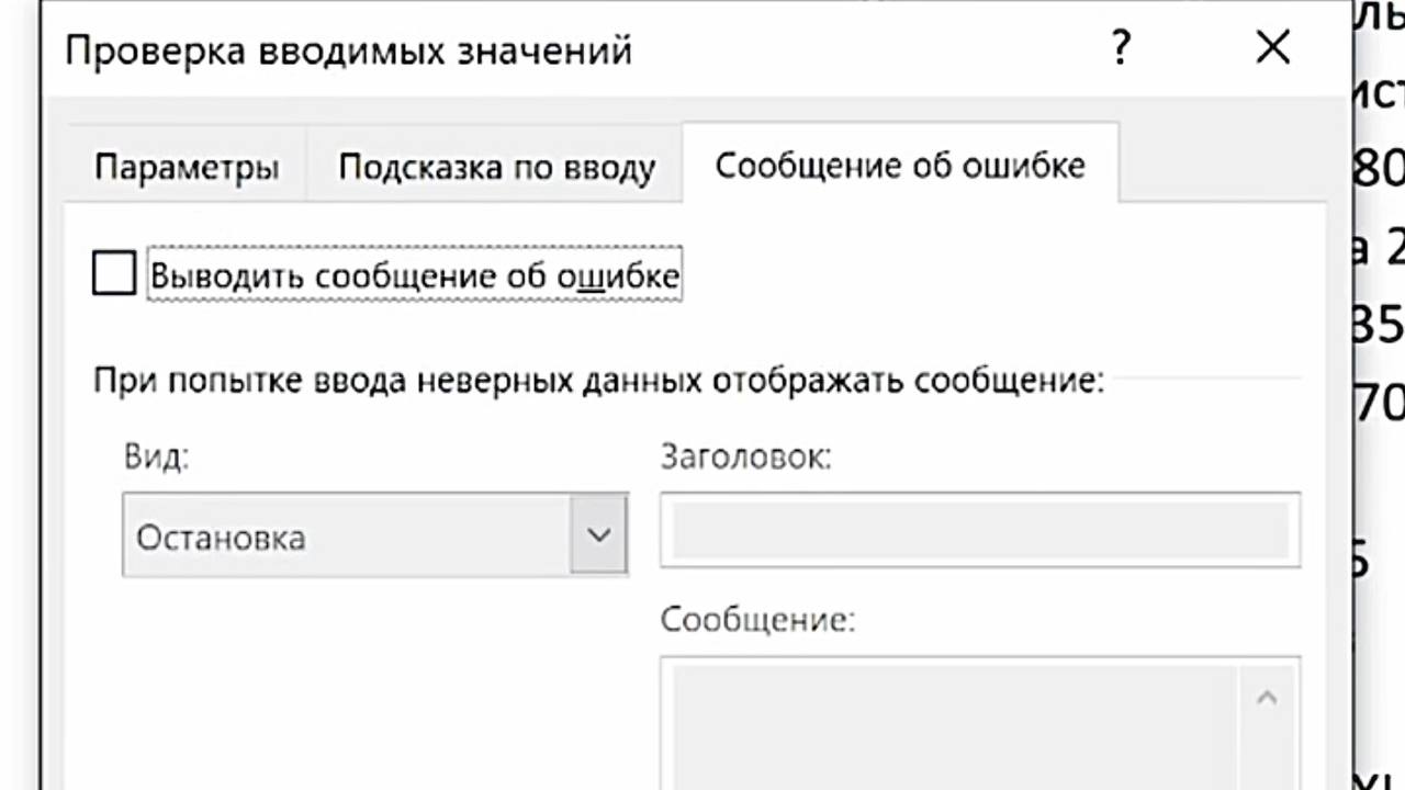 5. На вкладке «Сообщение об ошибке» снимите галочку «Выводить сообщение об ошибке», чтобы можно было вводить текст для поиска.