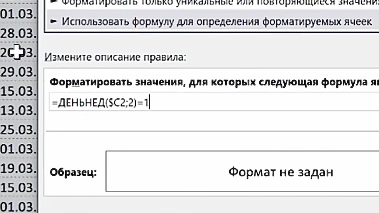 Просматривать даты вручную и раскрашивать их — долго и неэффективно. Условное форматирование позволяет автоматически подсветить нужные дни недели, анализируя даты в ячейках.