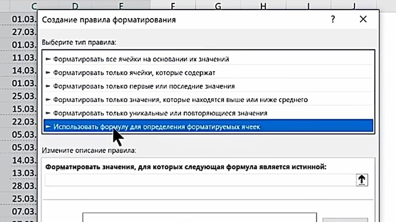 4. В открывшемся окне выберите тип правила: «Использовать формулу для определения форматируемых ячеек».
