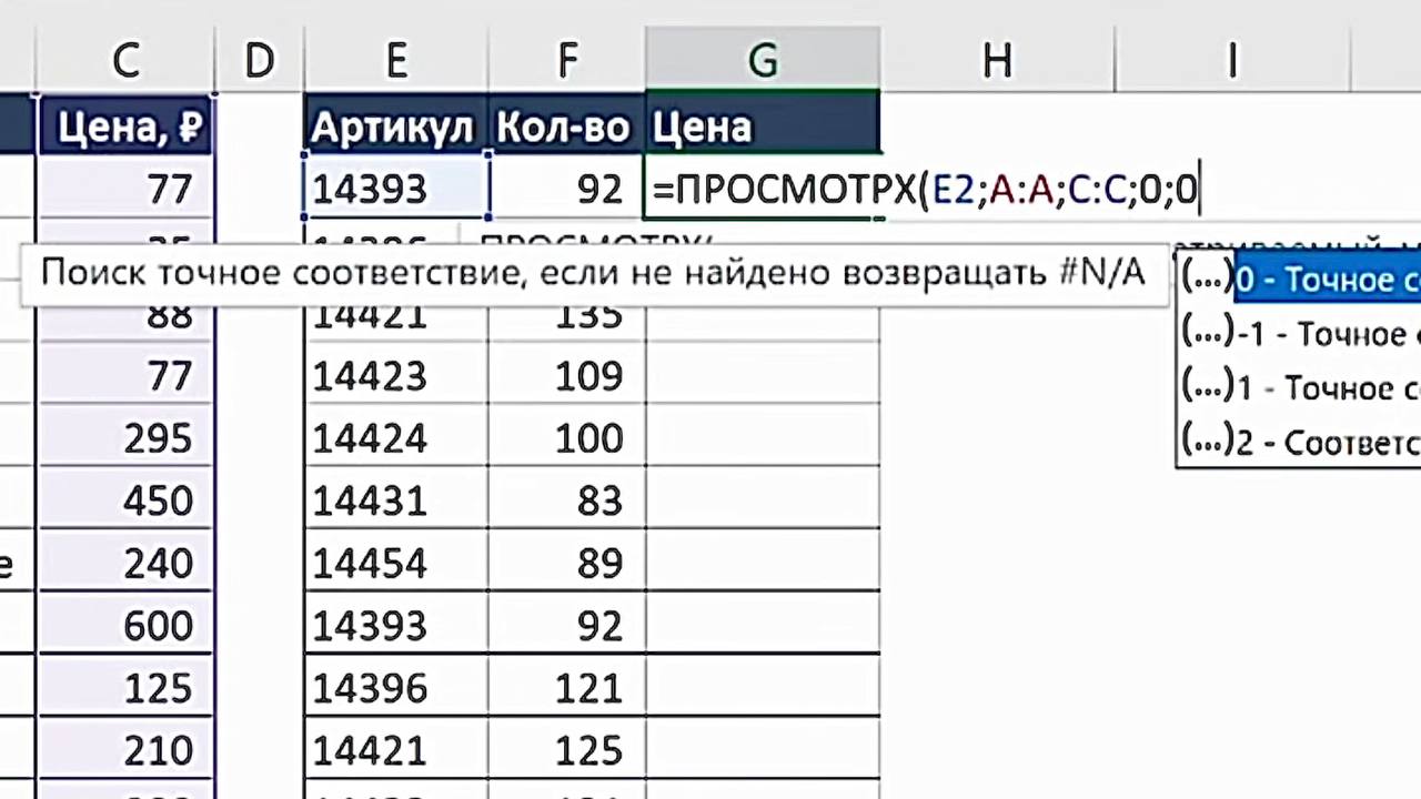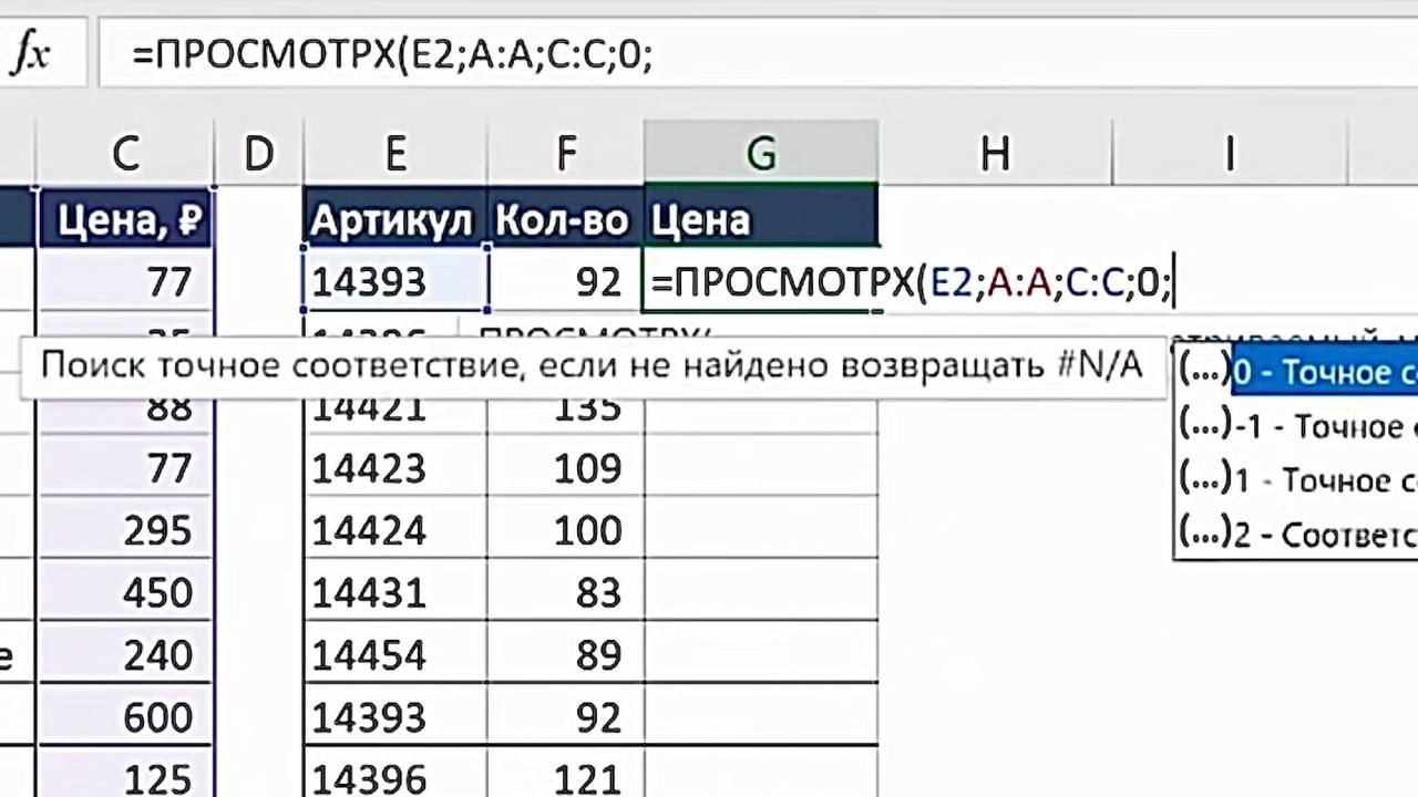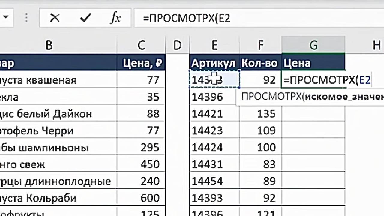 3. Укажите искомое значение — это артикул из основной таблицы (например, ячейка E2).