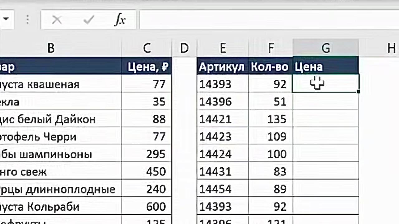- Встаньте в пустую ячейку основной таблицы, куда хотите подтянуть цену (например, напротив первого артикула).