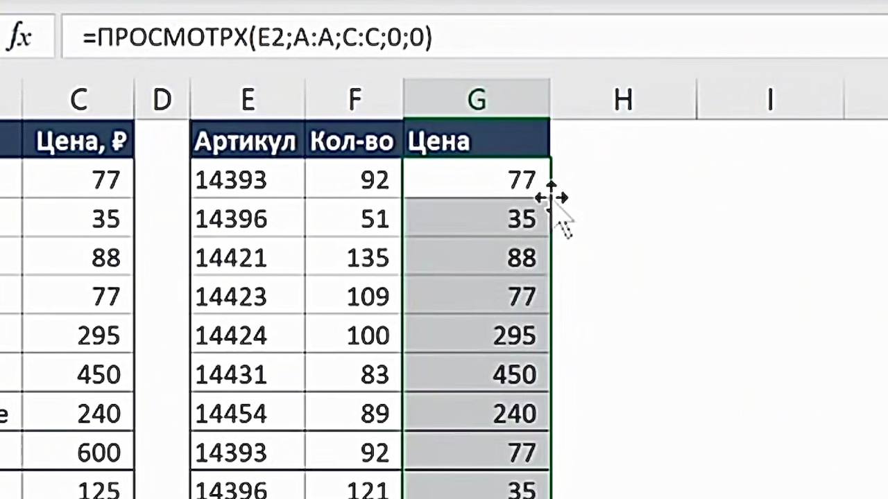 - Формула скопируется, и для каждого артикула подтянется соответствующая цена. Если артикул не найден — будет стоять 0.