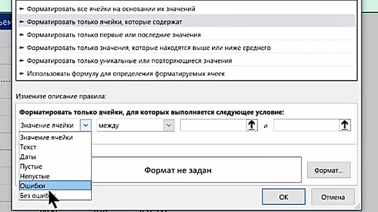 3. В первом выпадающем списке оставьте «Значение ячейки», во втором выберите «Ошибки».