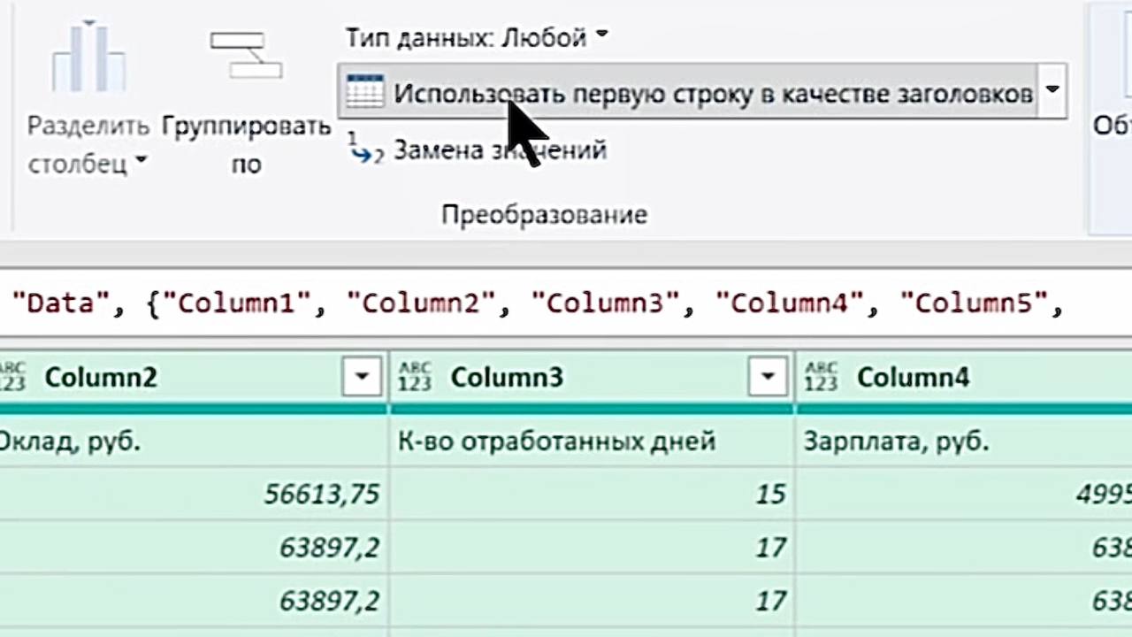 4. Теперь обратите внимание на первую строку данных — скорее всего, это заголовки столбцов, которые система восприняла как обычные значения. Чтобы исправить это, перейдите на вкладку «Главная» и нажмите «Использовать первую строку в качестве заголовков».