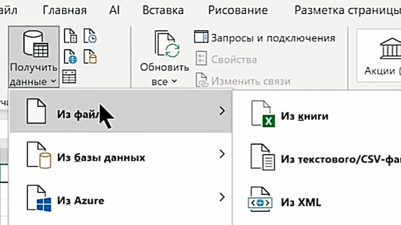 - Перейдите на вкладку «Данные» → в группе «Получение и преобразование данных» нажмите «Получить данные» → «Из файла» → «Из книги».