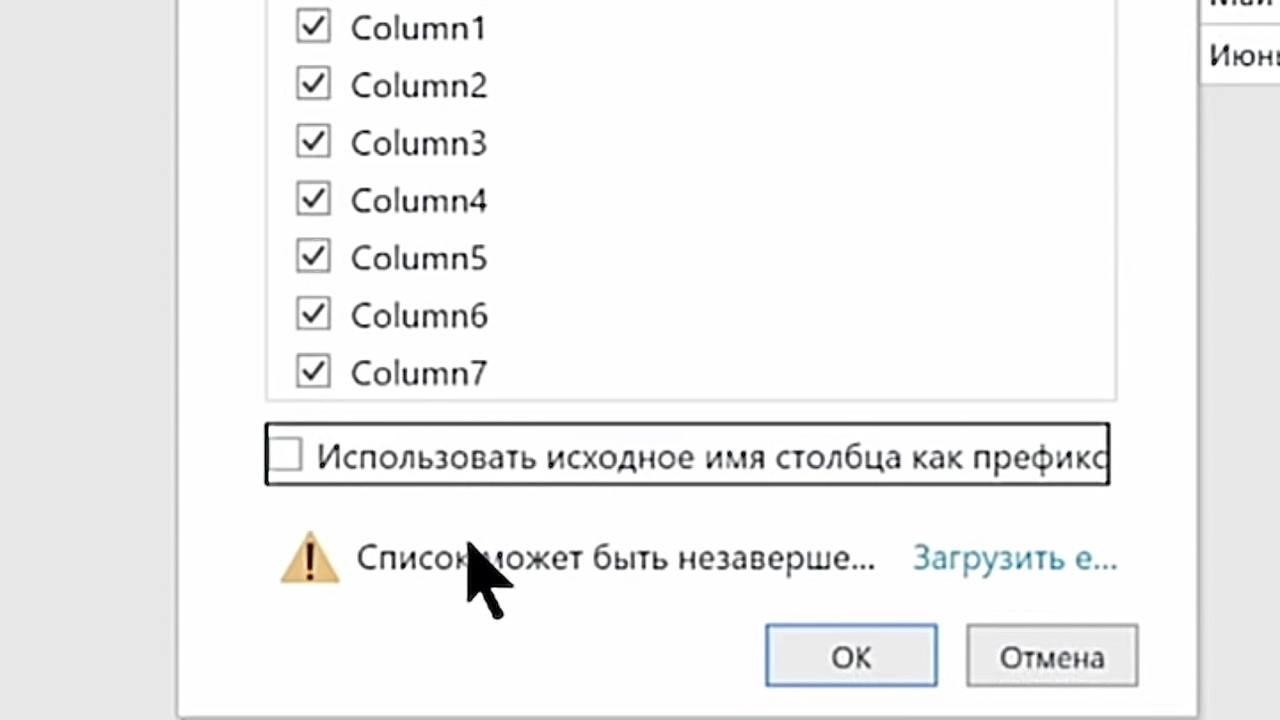 2. В открывшемся окне снимите галочку с пункта «Использовать исходное имя столбца как префикс».