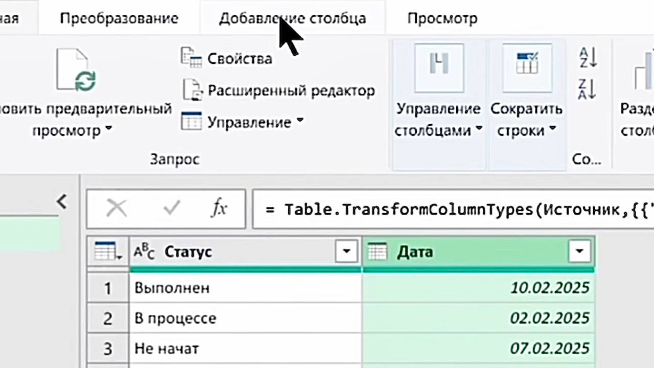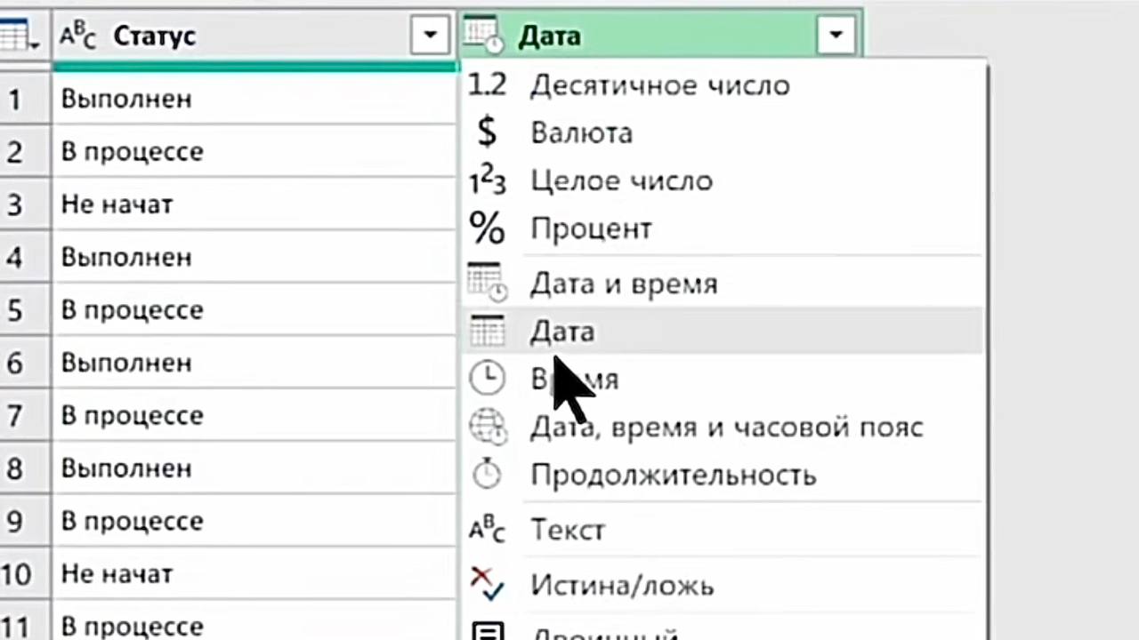 - В окне Power Query обратите внимание на значок слева от заголовка вашего столбца с датами. Он должен быть в виде календаря (📅), что означает тип данных «Дата».